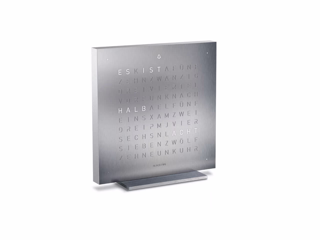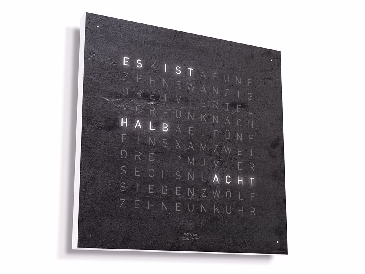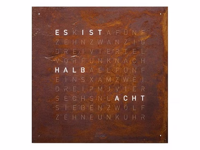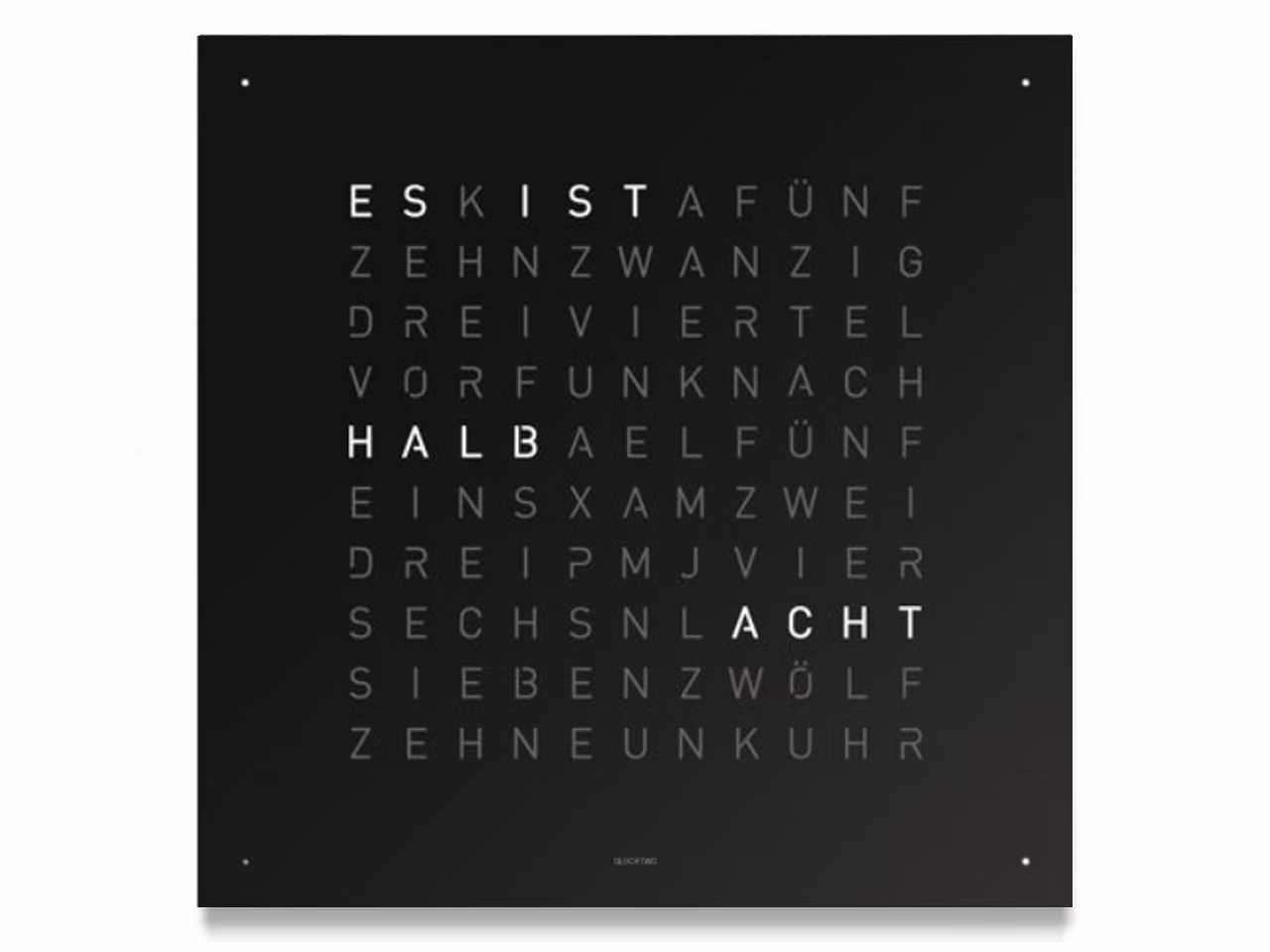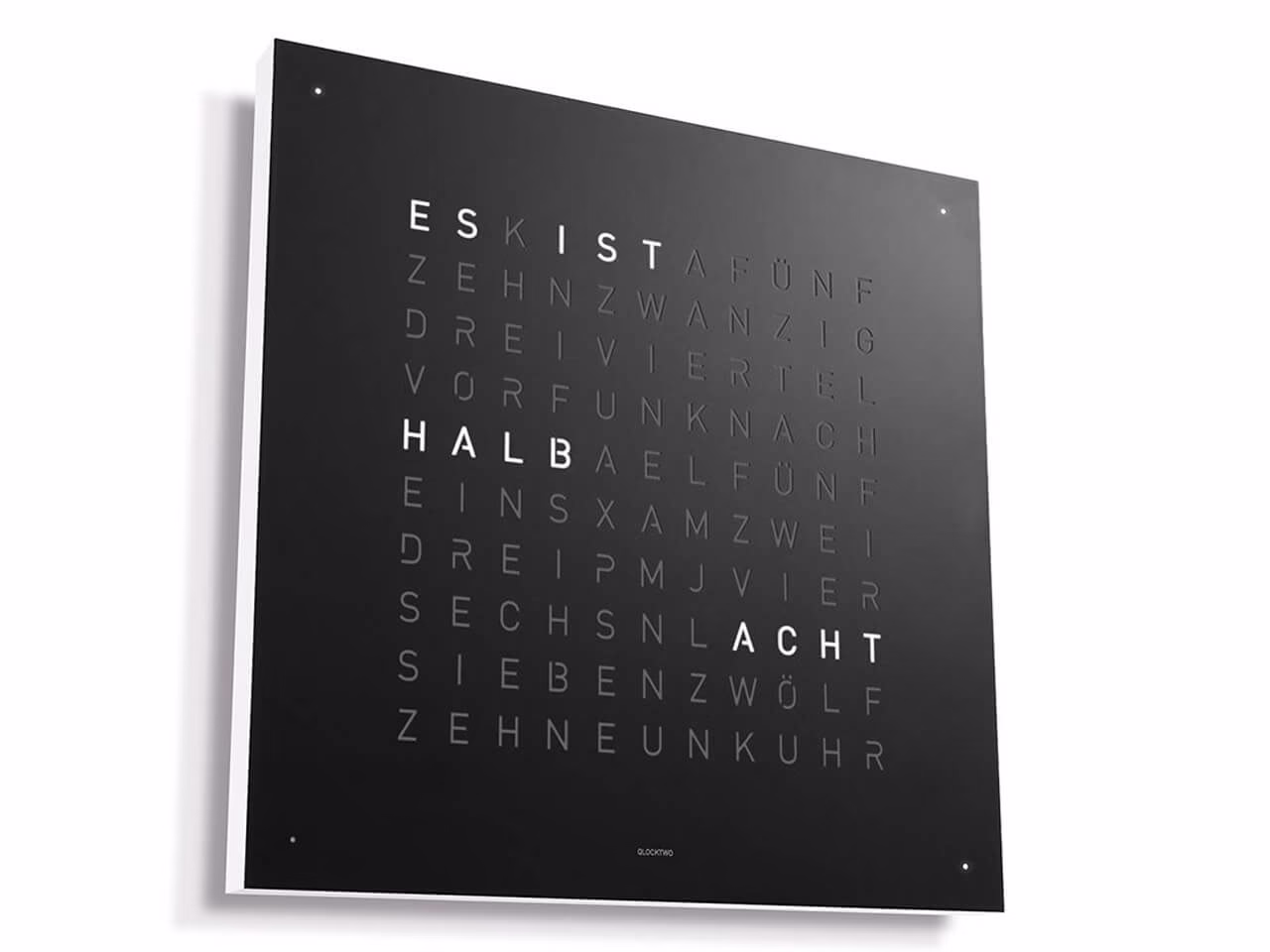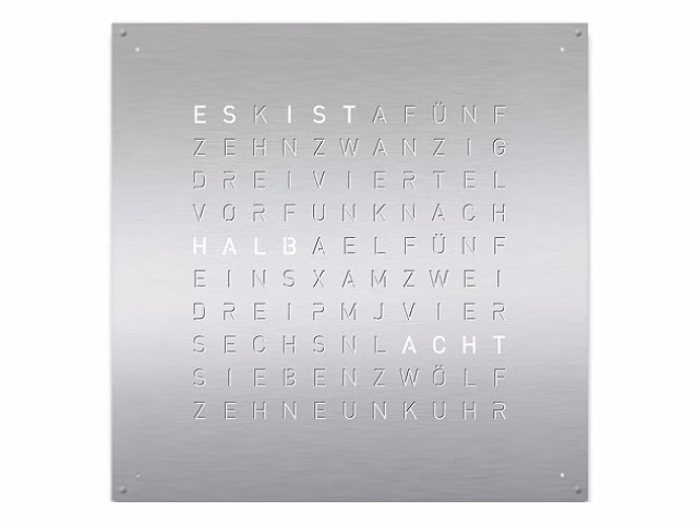 QLOCKTWO – Zeit in Worten. Die Typografische Anzeige verbindet den Moment mit dem geschriebenen Wort und macht ihn zum Statement.